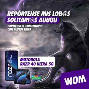 Gana un Motorola Razr 40 Ultra 5G en el concurso de WOM, si quieres llevártelo tendrás que hacerte seguidor de WOM en Facebook, likea la foto del concurso y comenta lo que quieras y si el 17 de marzo de 2024 tu comentario es el que tiene más likes estarás participando.